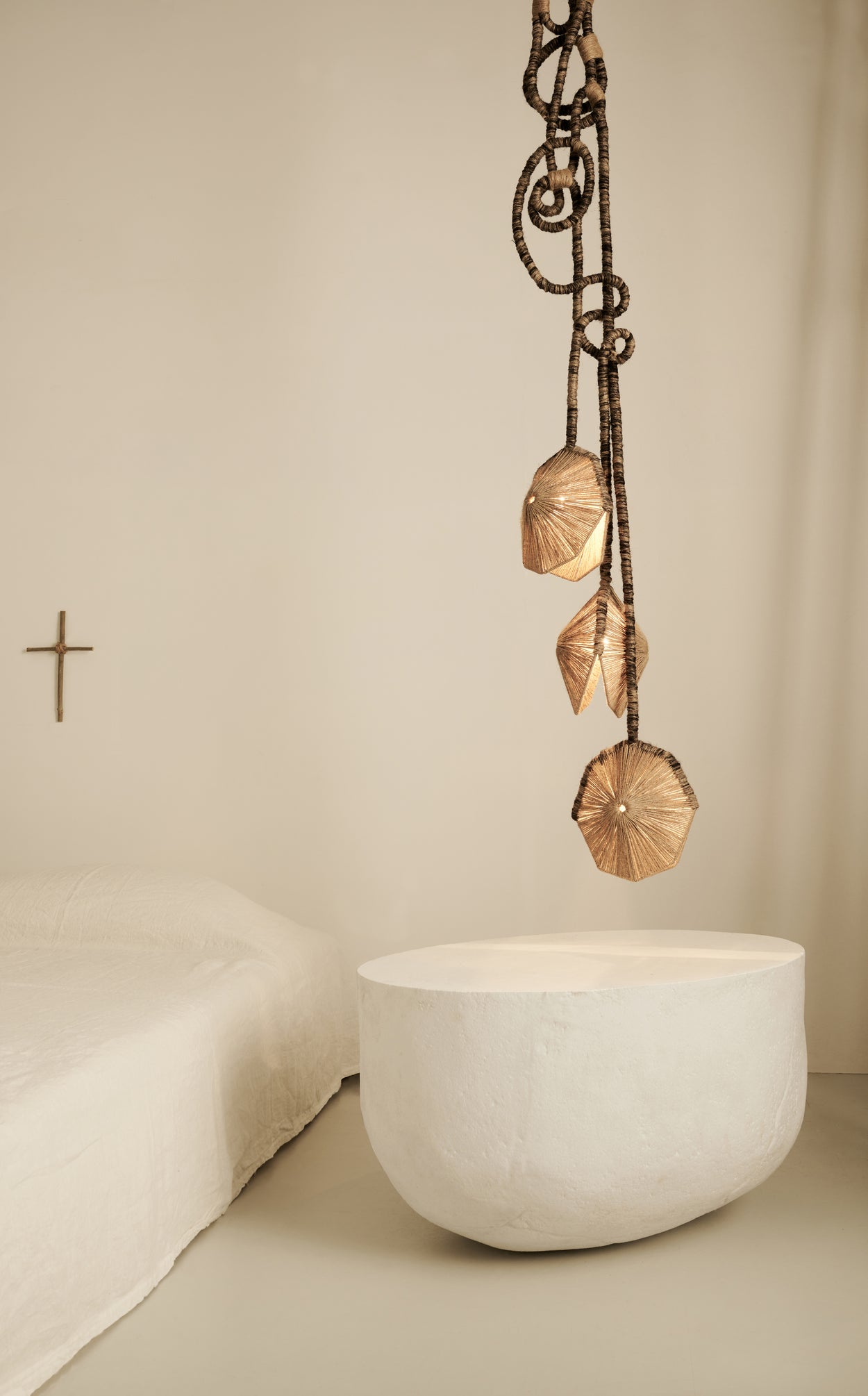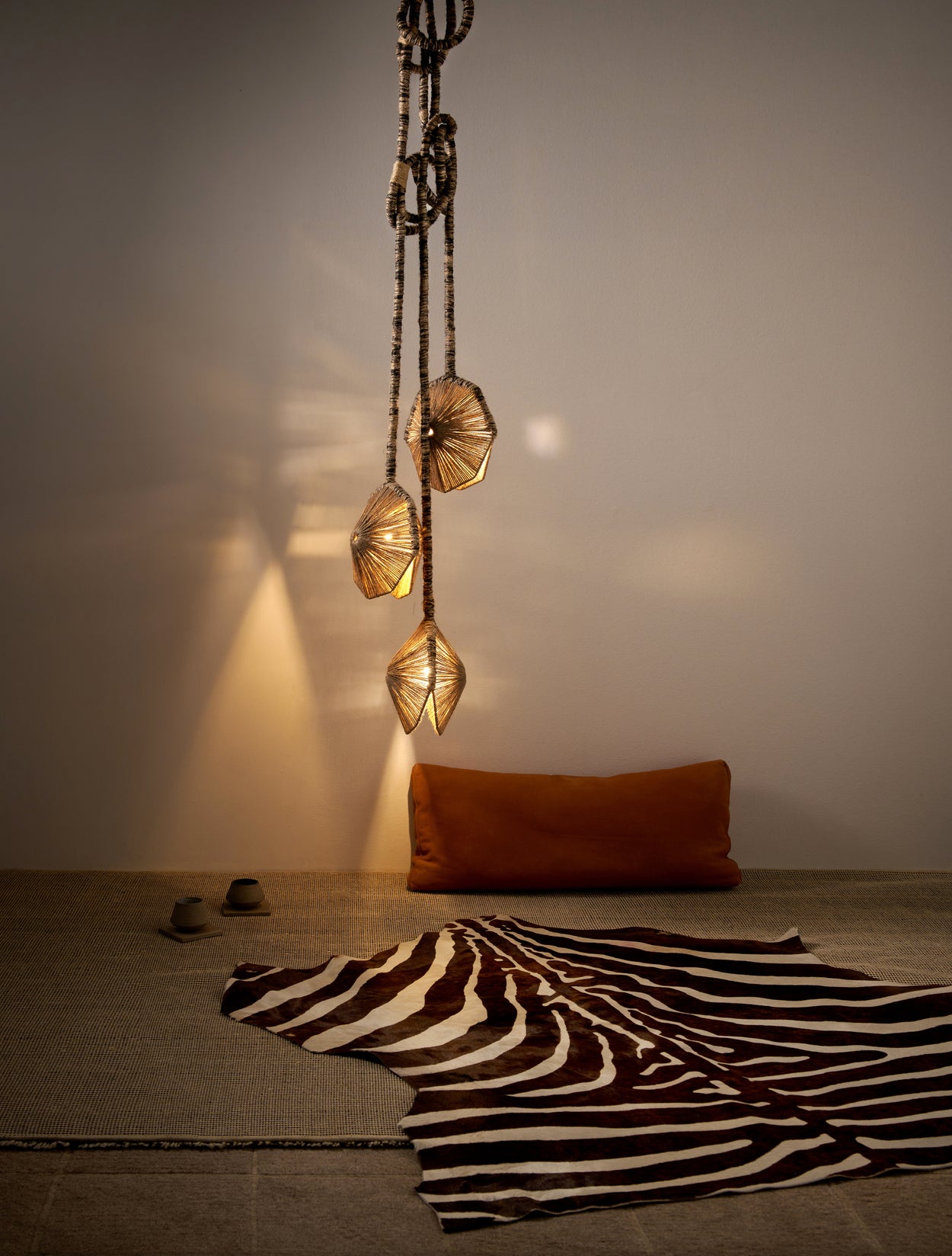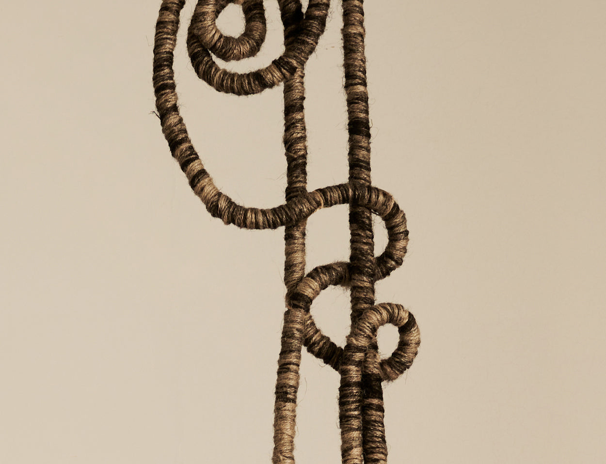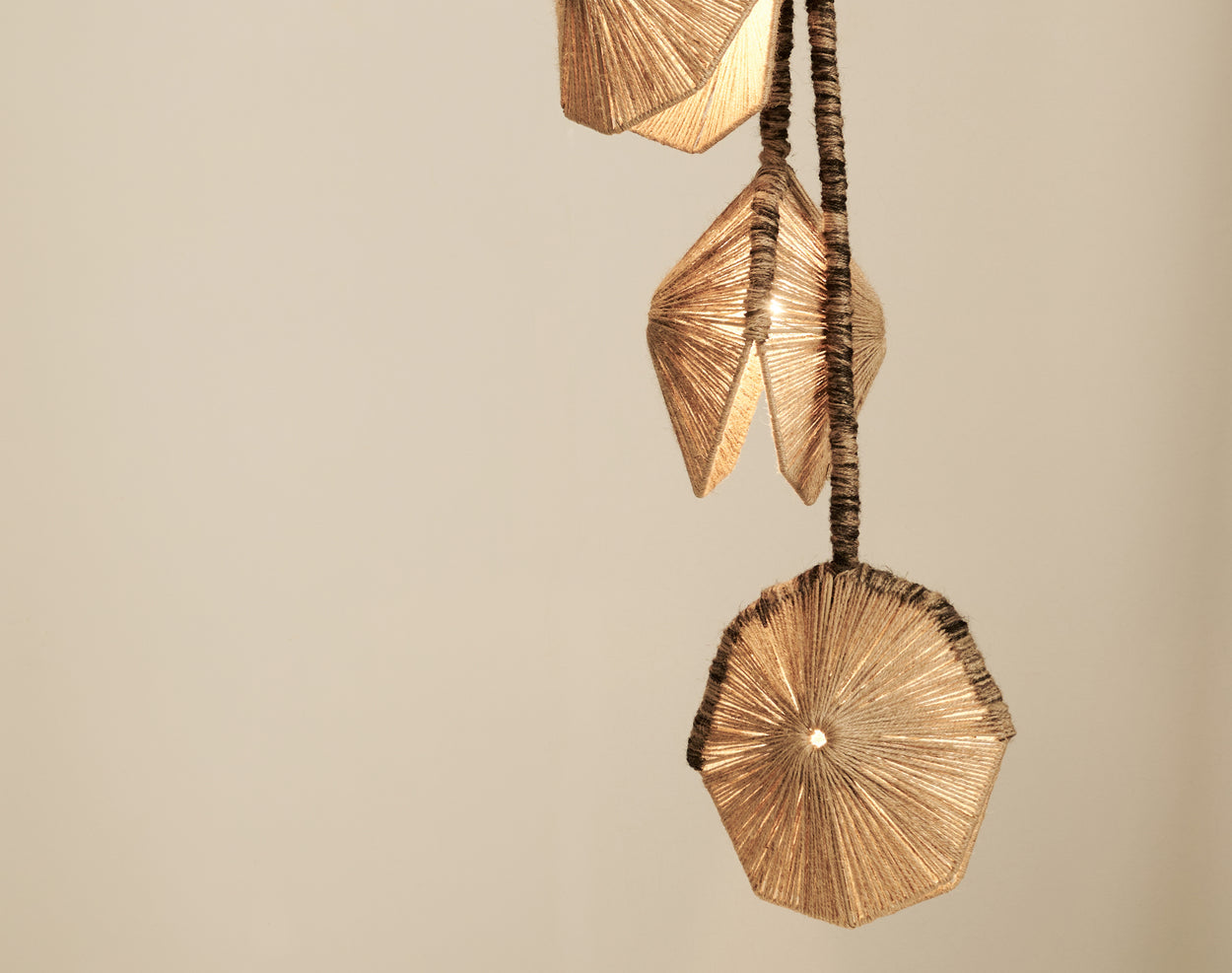 Inspired by ancient fossil stones, this triple pendant light narrates the story of cosmic existence. Spiral threads and knitted jute create an object of curiosity. Available in natural beige or black, it is handcrafted with jute giving a more earthy essence in space.