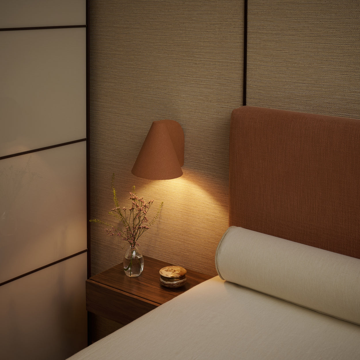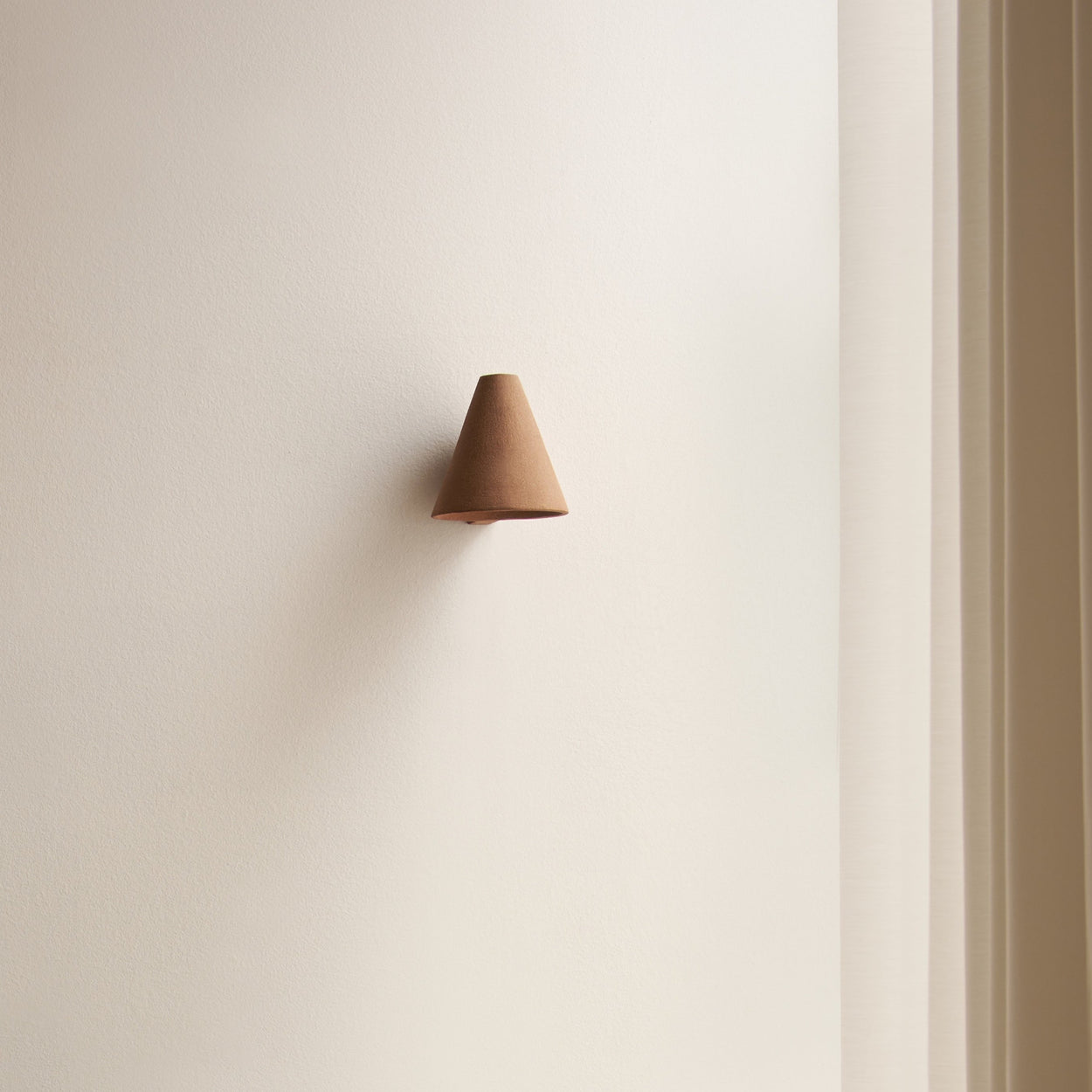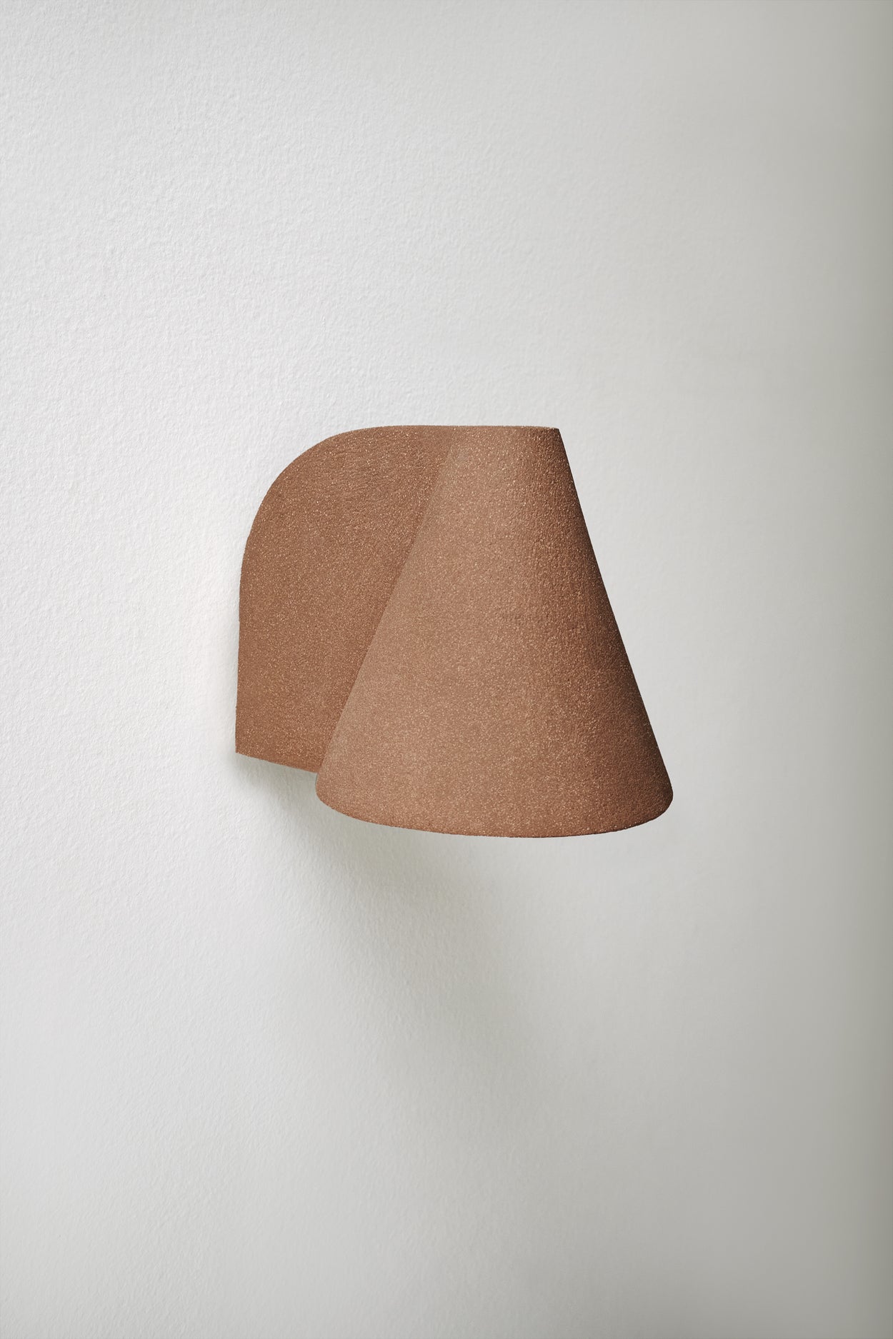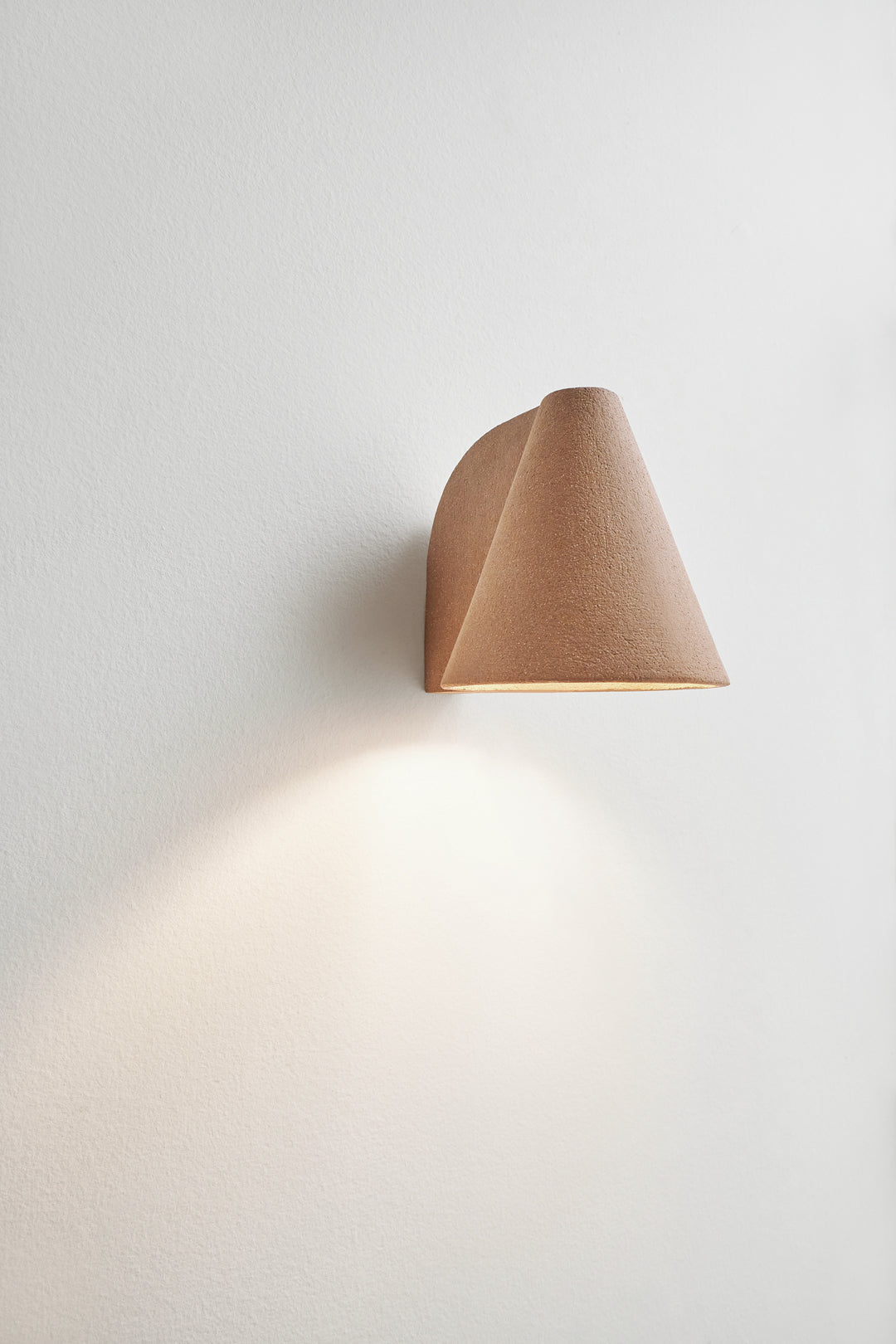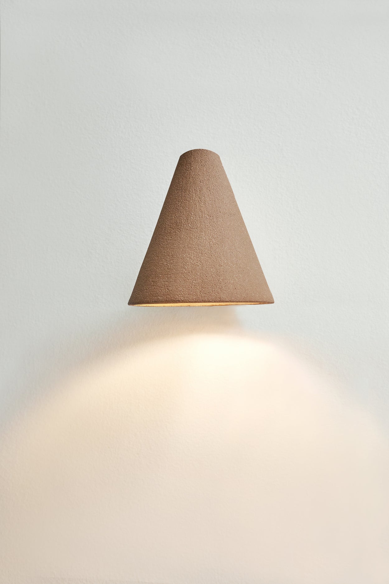 A combination of forms create a clean-cut, unfussy wall sconce. Shy and beautiful in its simplicity sheds light in any pathway. Handcrafted of granular stoneware creating a rough texture, it is available in off-white, anthracite black or almond brown color.