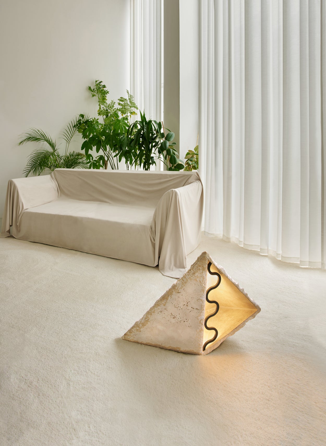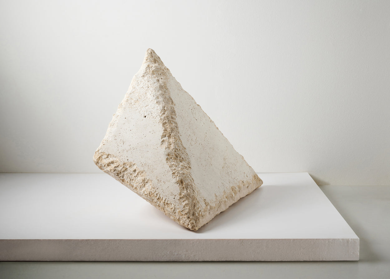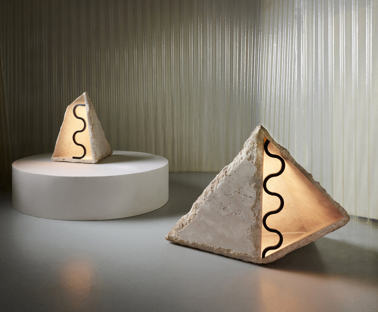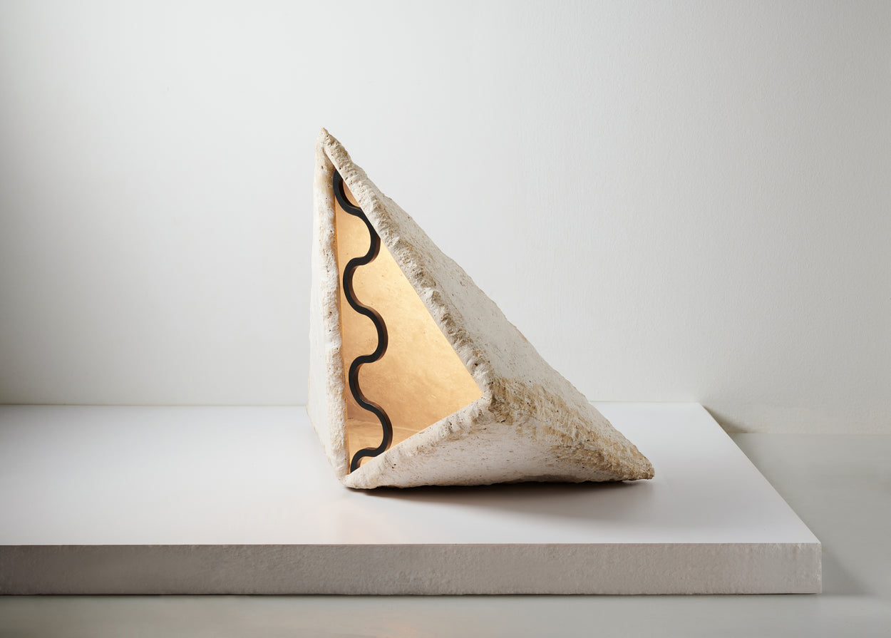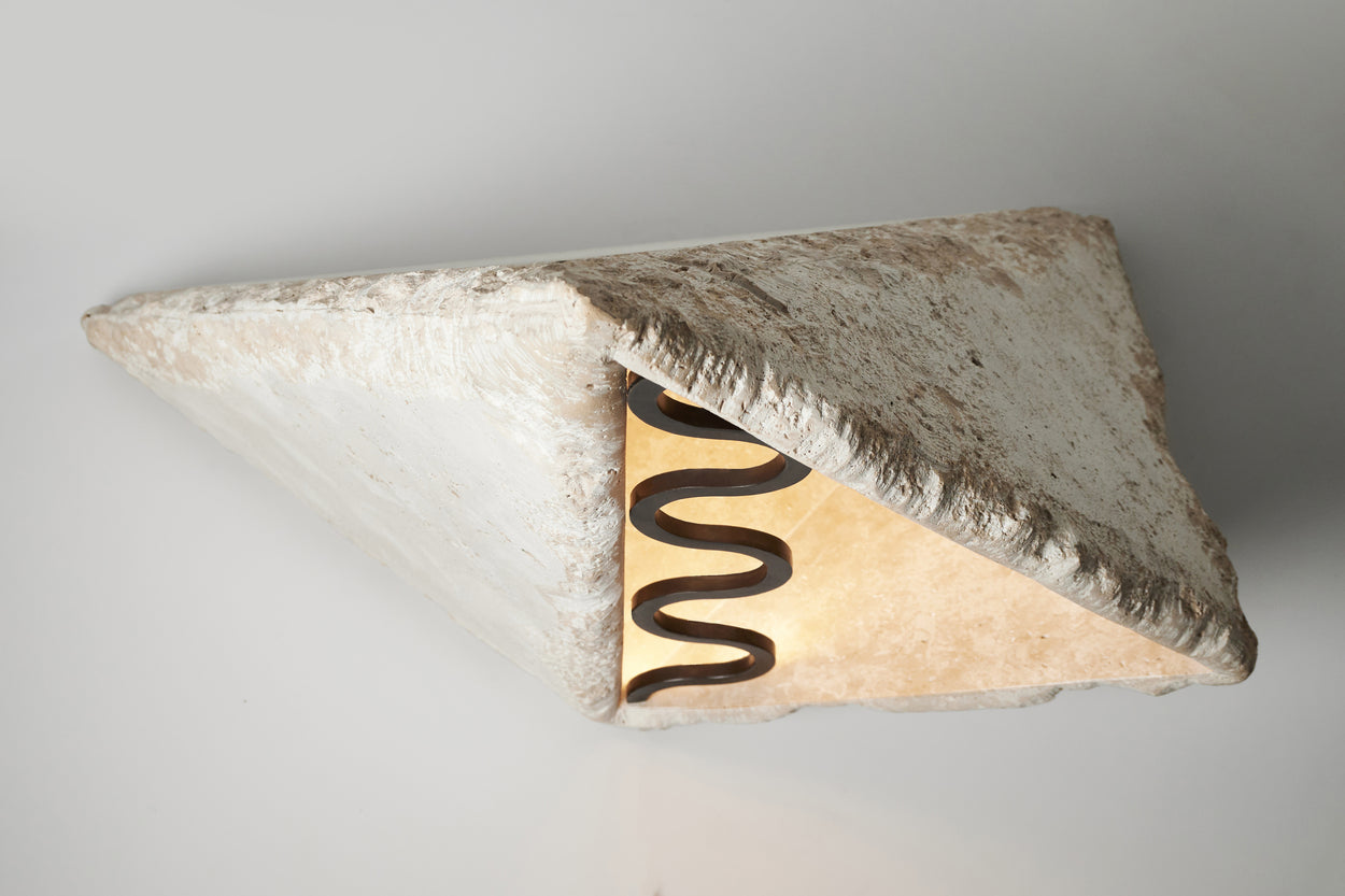 A sculptural way to light up paths and gardens as the reflected light paves the way. The outdoor monolithic floor light is chiseled out of travertine by hand and encompasses all the mysticism of nature inside the pyramid. The light source’s brass housing has a rhythmic pattern and is handmade to match every polymorphic stone. The oxidized patina blends harmonically in the outdoor environment.