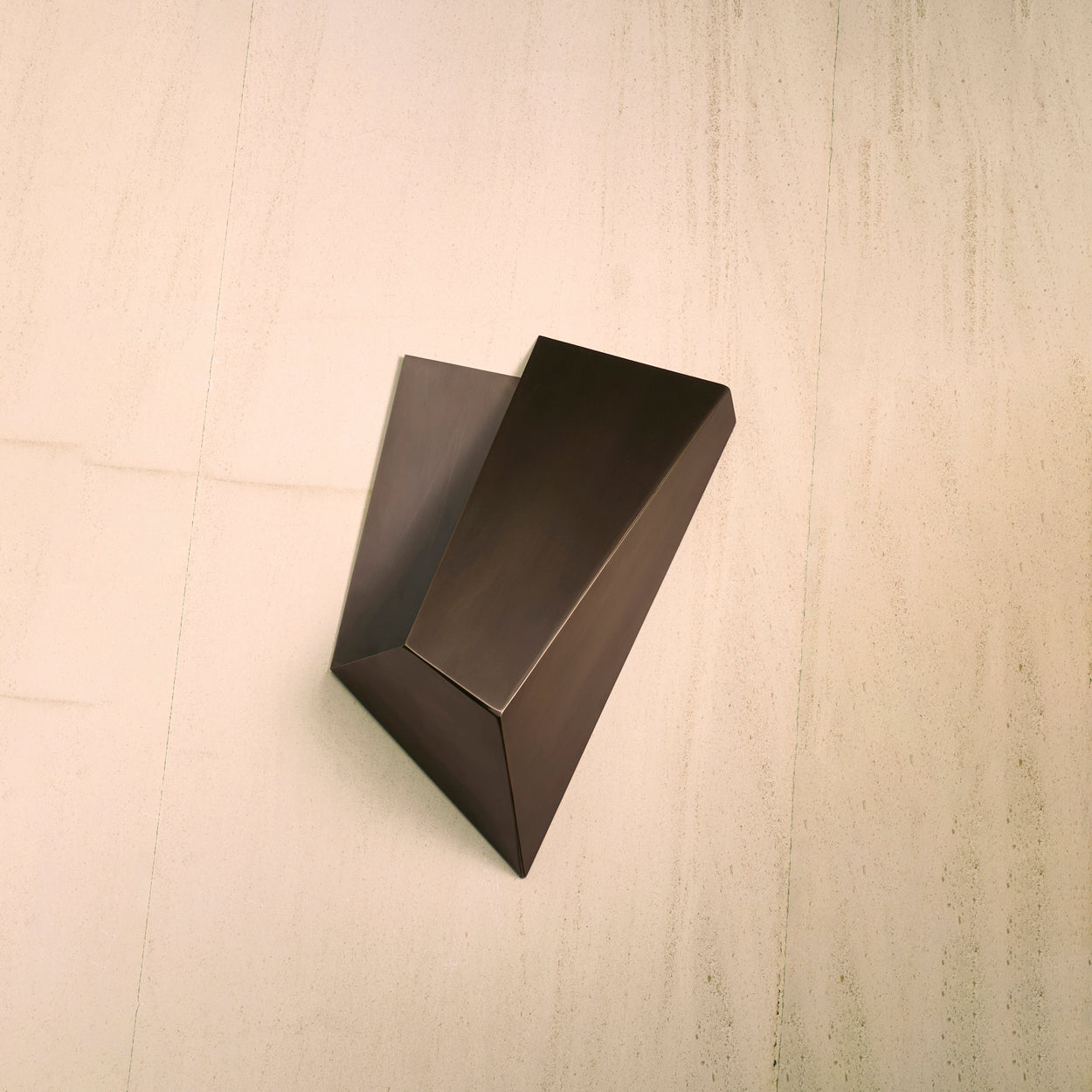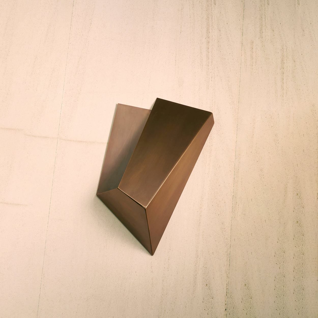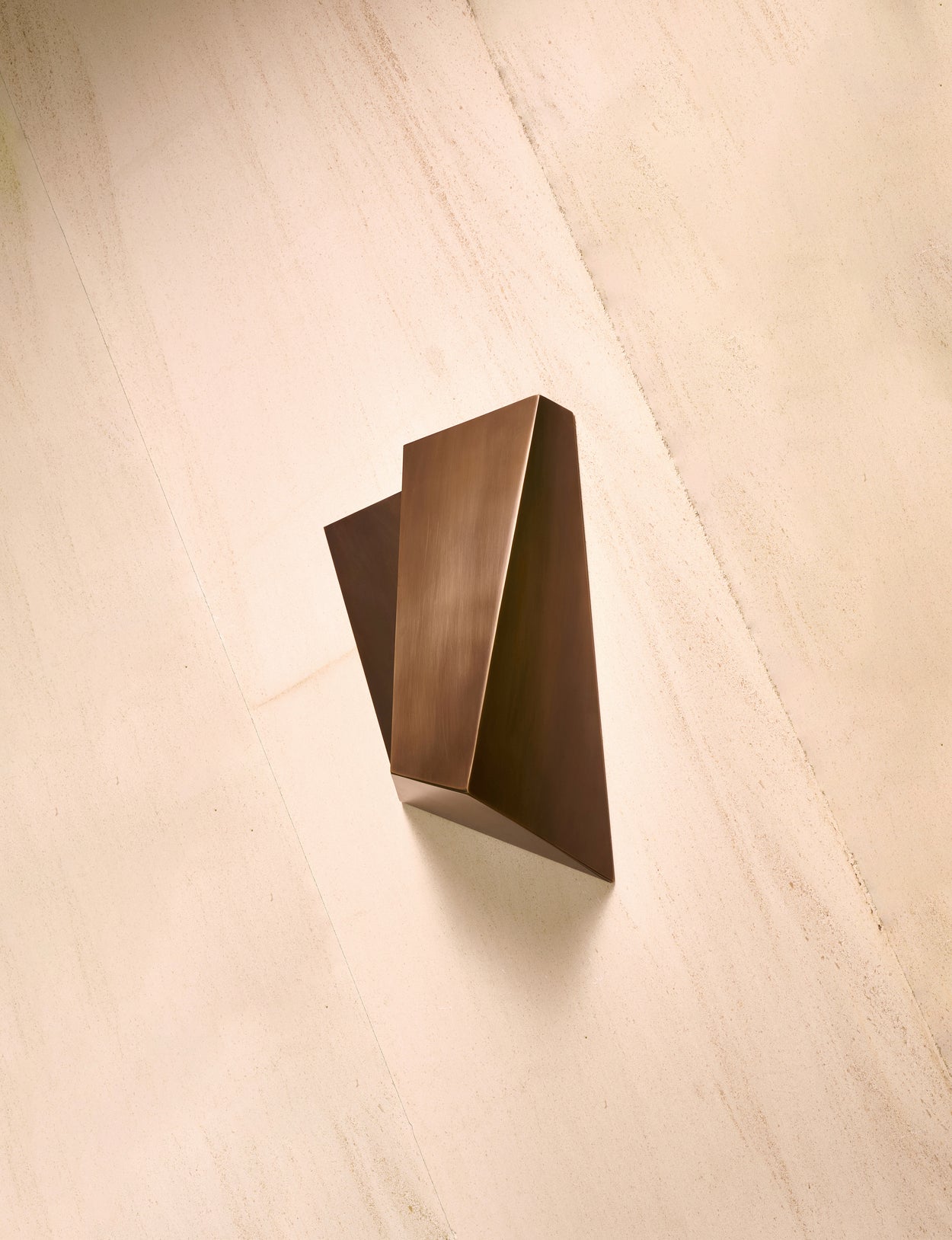 A polyhedron handmade of brass opens up to magic. This sculptural lighting is available in oxidized brass in bronze color. Katoptris sconce can also be customized and flipped horizontally upon request.