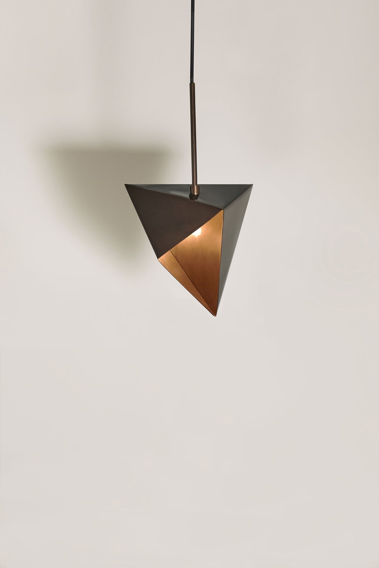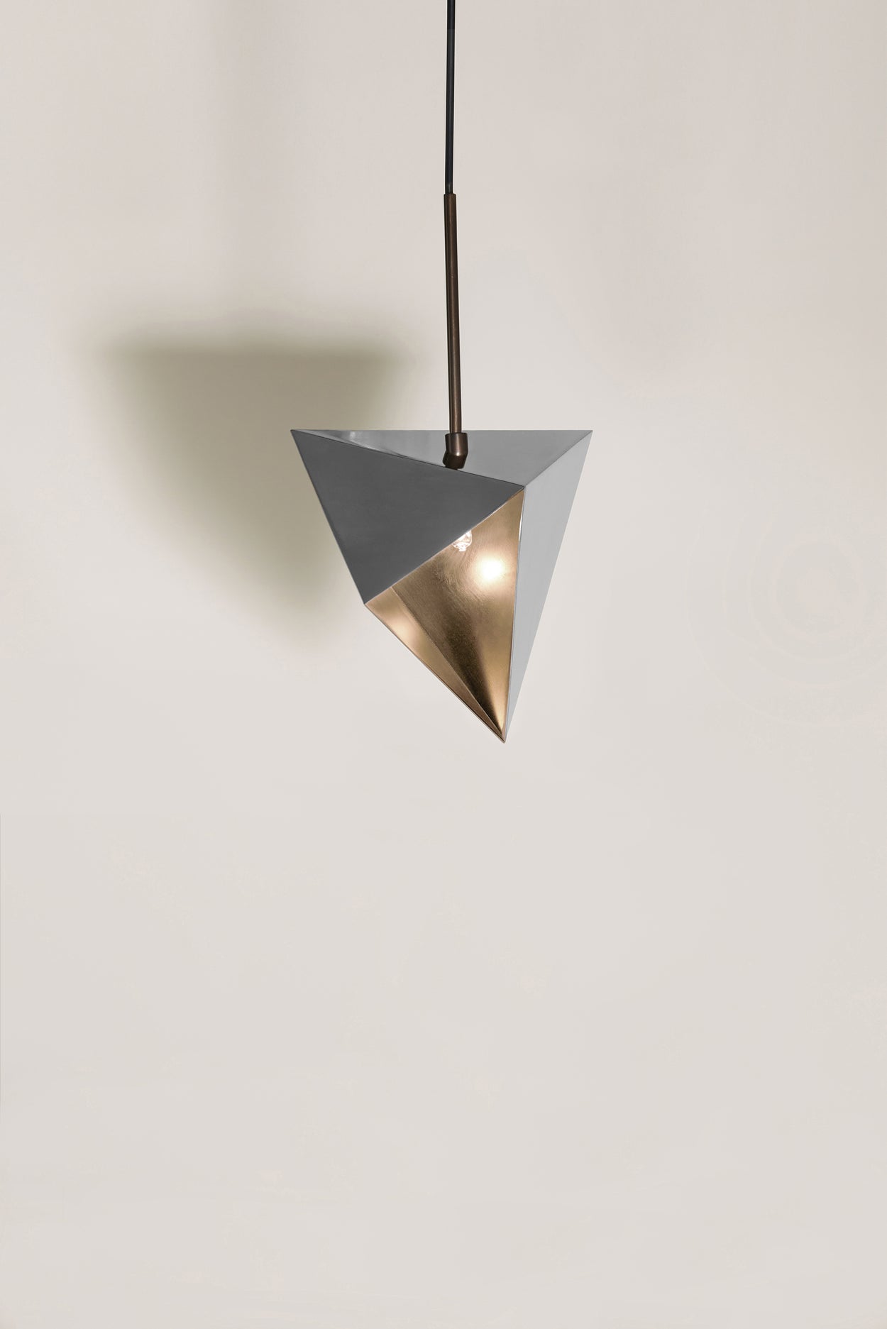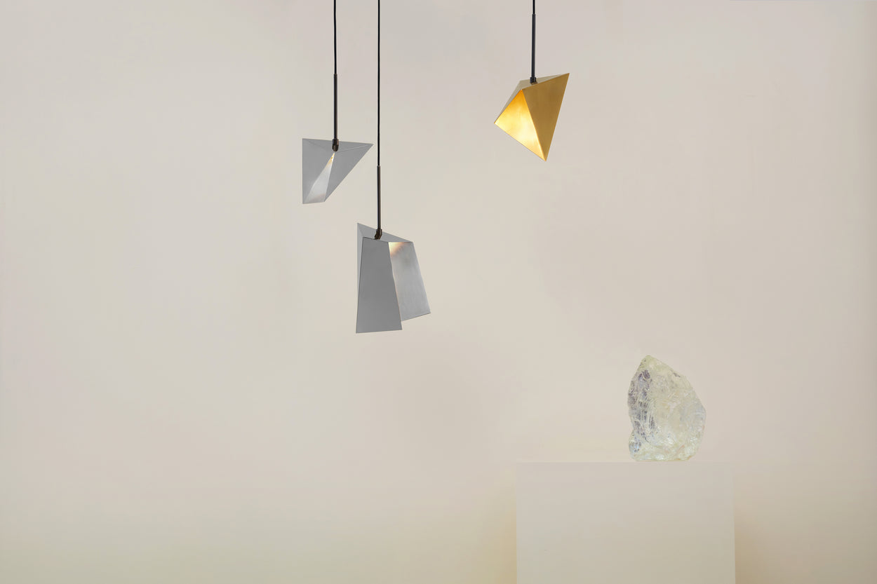 A pendant geometric lighting element allowing light to emerge from small leaks and compose a starry night. Set up your own synthesis of Meteoroids by placing them in order and unveil your own harmony-cosmos. Although made of brass, these pendant geometric lights have sculptural folding pattern. Available in chrome, bronze gloss or bronze matt finish.
