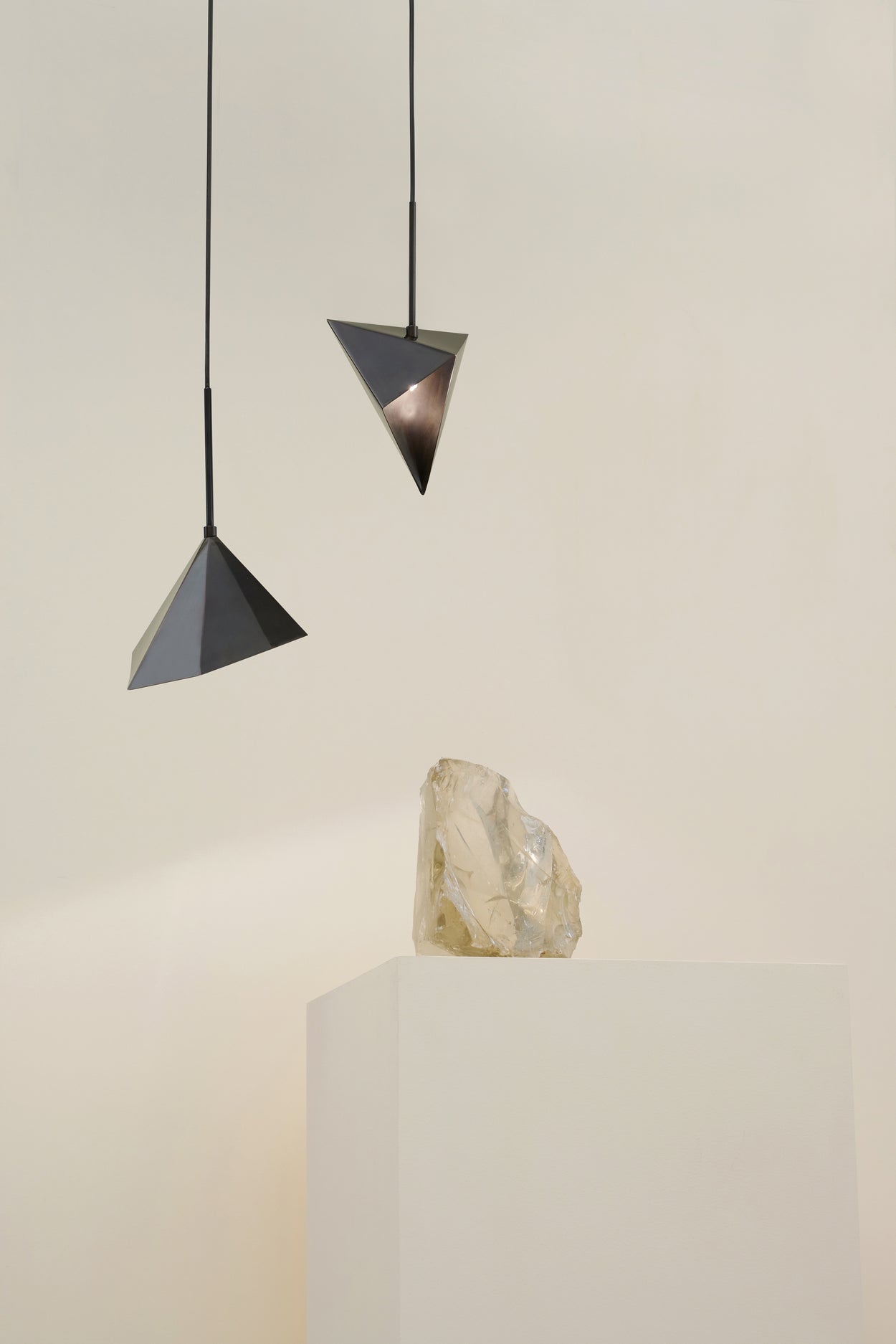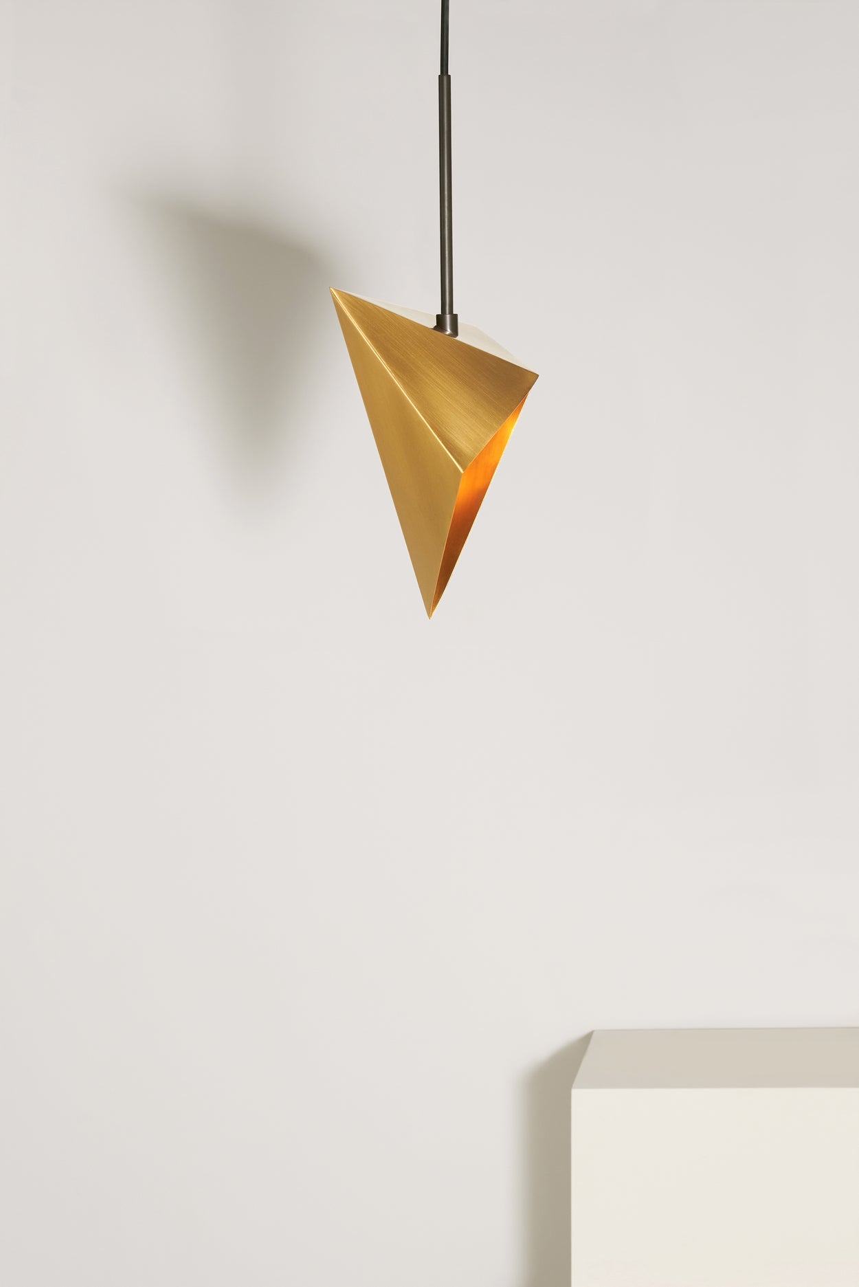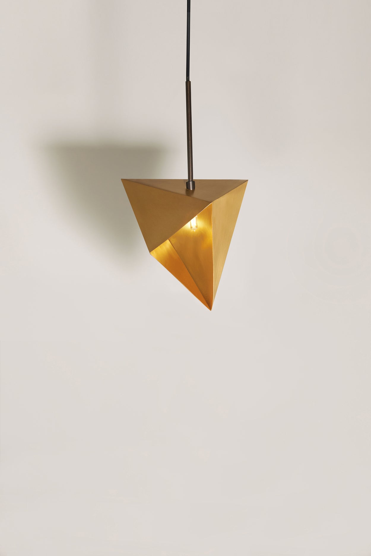 A pendant geometric lighting element allowing light to emerge from small leaks and compose a starry night. Set up your own synthesis of Meteoroids by placing them in order and unveil your own harmony-cosmos. Although made of brass, these pendant geometric lights have sculptural folding pattern. Available in chrome, bronze gloss or bronze matt finish.