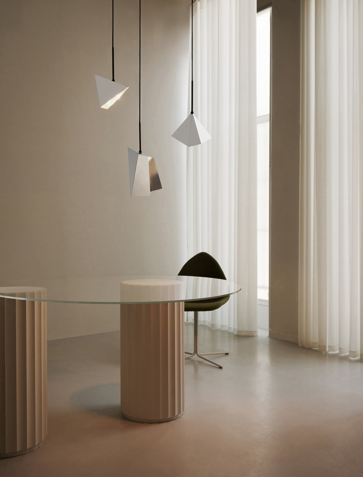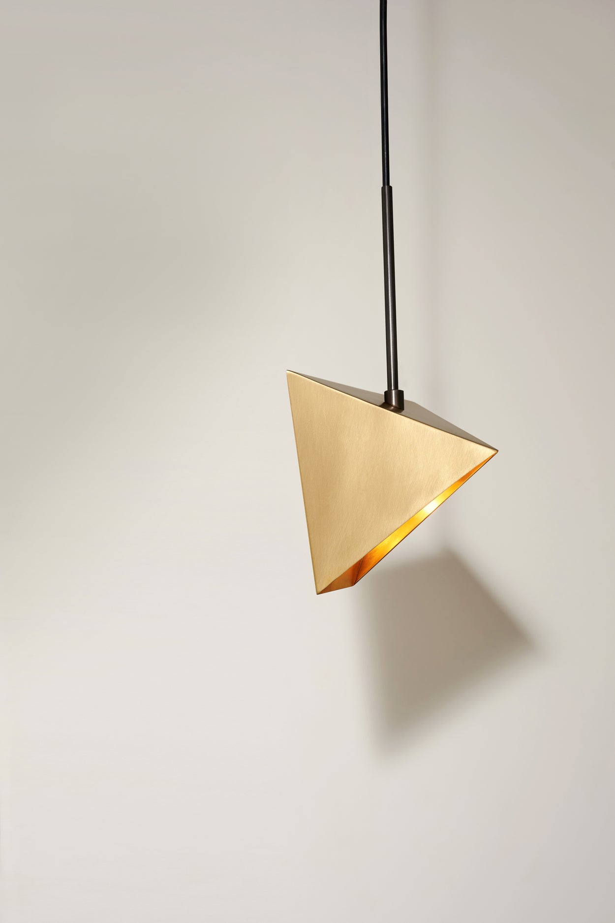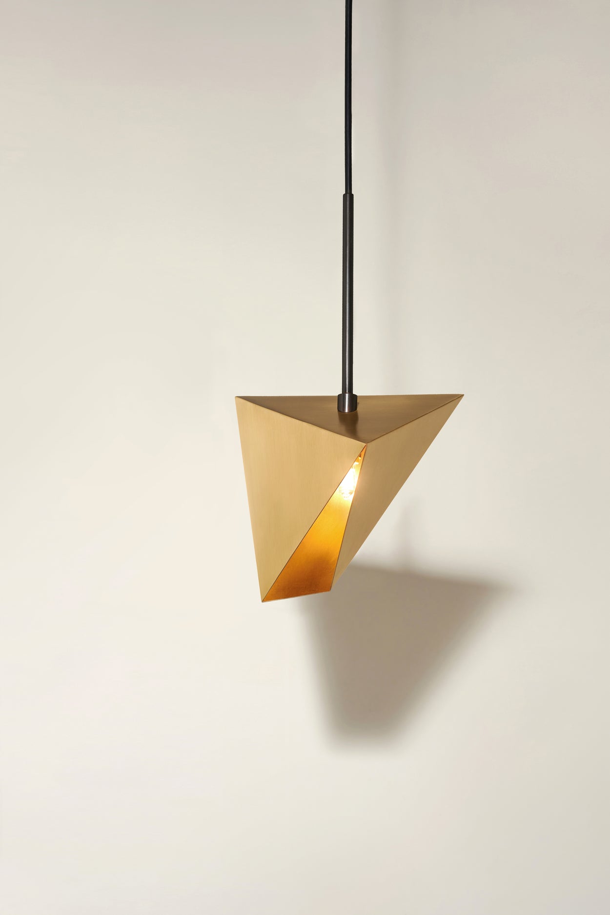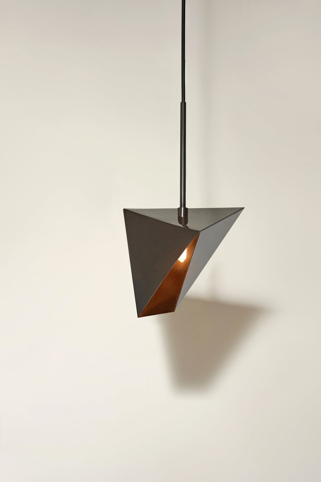 A pendant geometric element allowing light to emerge from small leaks and compose a starry night. Set up your own synthesis of Meteoroids by placing them in order and unveil your own harmony-cosmos. Although made of brass, these pendant geometric lights have sculptural folding pattern. Available in chrome, bronze gloss or bronze matt finish.