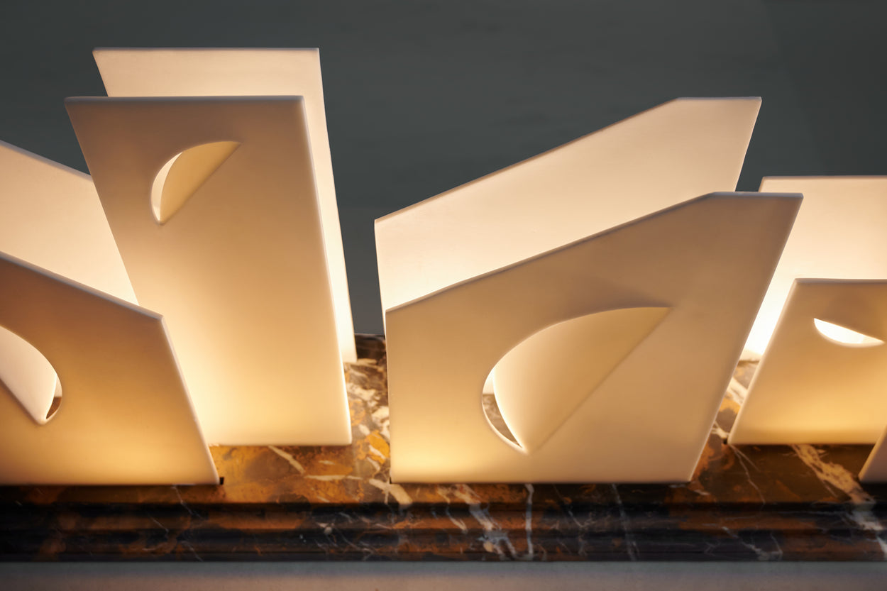 A sculptural synthesis bringing continuity, flow, rhythm and balance. Every piece of this table light is unique, composed of circular and rectangular forms. The porcelain made with care becomes very thin and delicate and through its high transparency lets the light flow and brings the warmth of yellowish light. Handmade from scratch of porcelain plates and marble base.