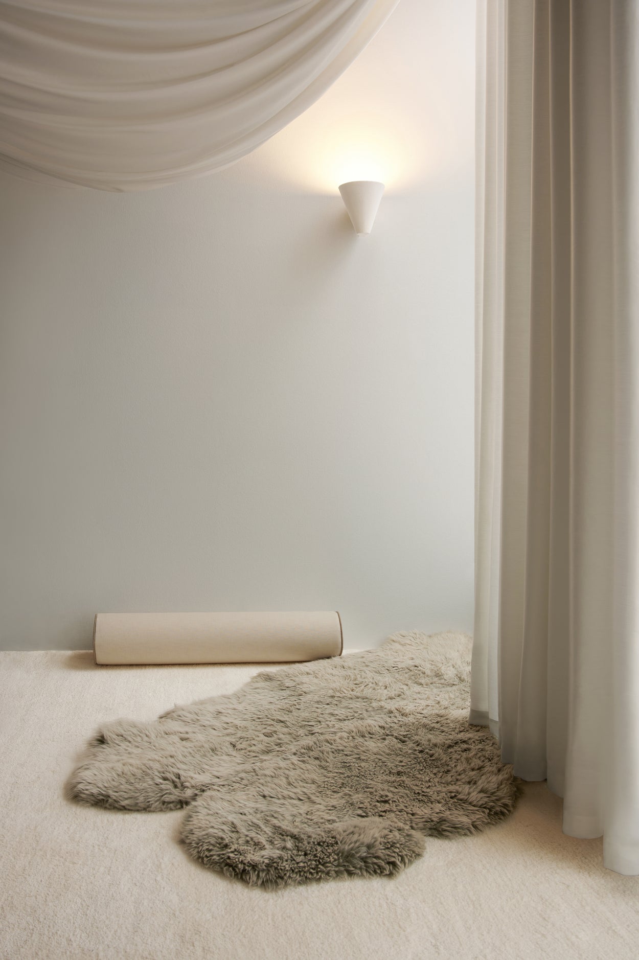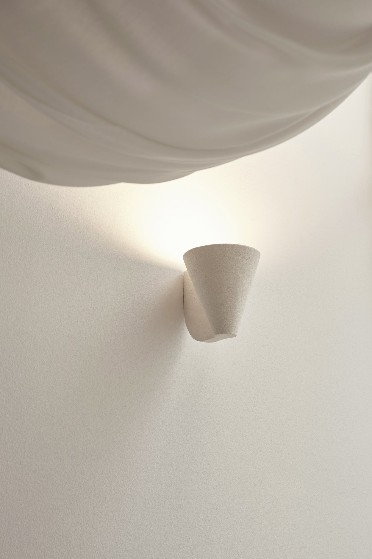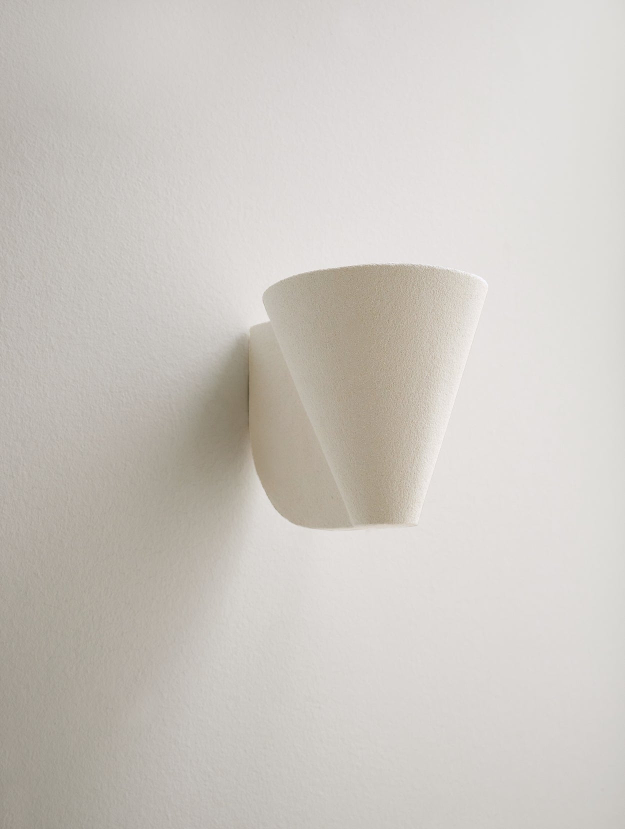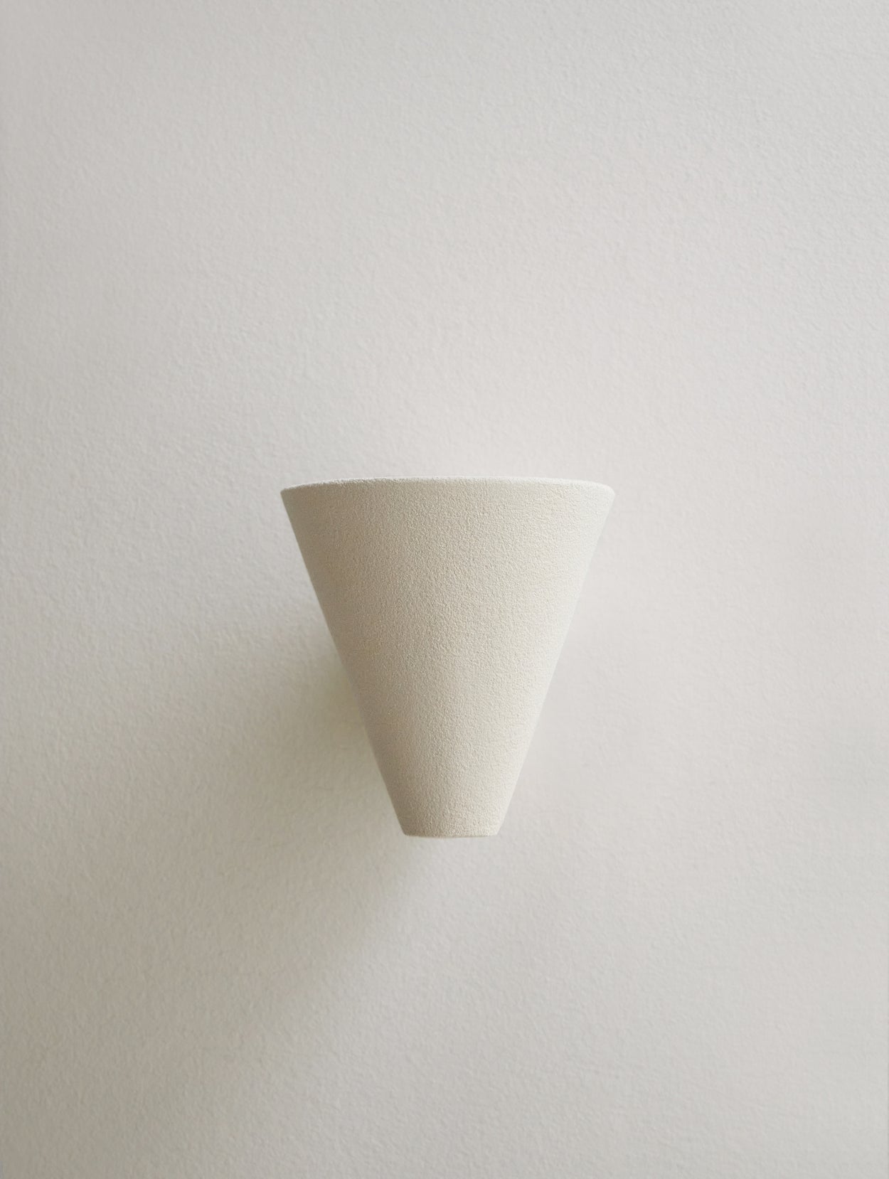A subtle feature guiding the eye upwards. Sculptural yet sophisticated, this wall sconce creates a celestial indirect lighting. Handcrafted of granular stoneware creating a rough texture, it is available in off-white color.